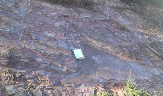 Neste afloramento ocorrem rochas do tipo ardósia em transição com
