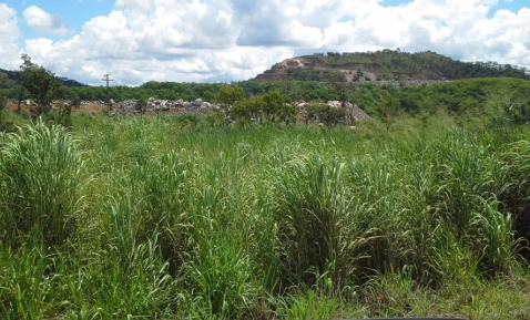 Neste trecho lateral da DF-205 ocorre a frente de lavra de calcário/mármore a céu